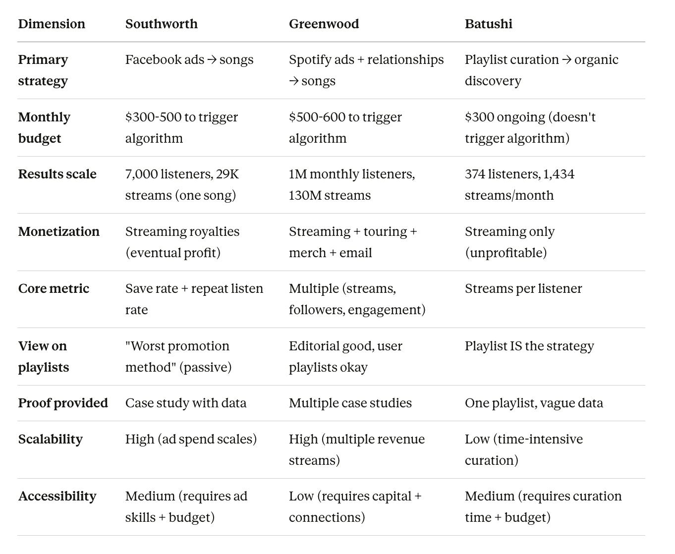 Comparing Batushi to Southworth and Greenwood exposes the playbook’s fundamental limitation: it’s micro-strategy for artists willing to accept micro-results. Southworth and Greenwood describe paths to thousands of listeners, hundreds of thousands of streams, eventually profitable operations. Their strategies require more capital ($500-5,000 per song) and more sophistication (ad platform mastery, relationship building, multi-channel integration), but they scale. Batushi describes path to hundreds of listeners and thousands of streams. His strategy requires less capital ($300/month) and different skills (curation, patience, data analysis), but it doesn’t scale—or at least, he hasn’t shown that it does. Maybe the curator approach hits inflection point at 10,000 playlist followers, where conversion rates and algorithmic pickup create exponential growth. But Batushi stopped at 2,500, and without data from others who’ve pushed past that threshold, we’re left guessing whether the strategy has ceiling or just needs more time.