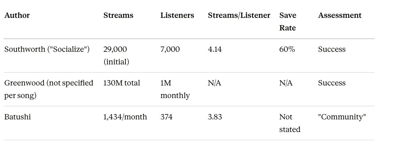 But the evidence that this strategy outperforms alternatives is absent. Southworth drove 7,000 listeners with $300 in Facebook ads. Batushi reached 374 listeners with years of effort and ongoing $300 monthly spend. If the goal is building audience, Southworth’s direct approach outperforms by roughly 20x. If the goal is building “deeper” engagement, Southworth’s 3x repeat listen rate (streams per listener) approximately equals Batushi’s 3.83x. Batushi’s advantage—if there is one—must be sustainability or scalability. Maybe playlist followers compound over years while ad-driven listeners churn. But Batushi provides no longitudinal data. We don’t know if his 374 listeners are stable, growing, or declining. We don’t know how long it took to reach 2,500 playlist followers or whether growth has plateaued.