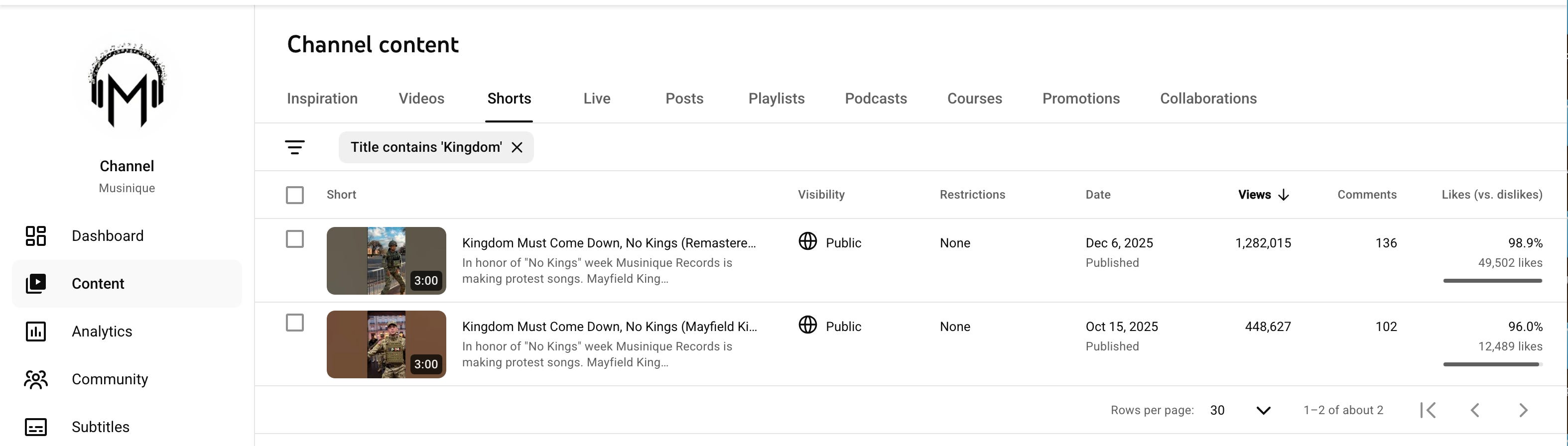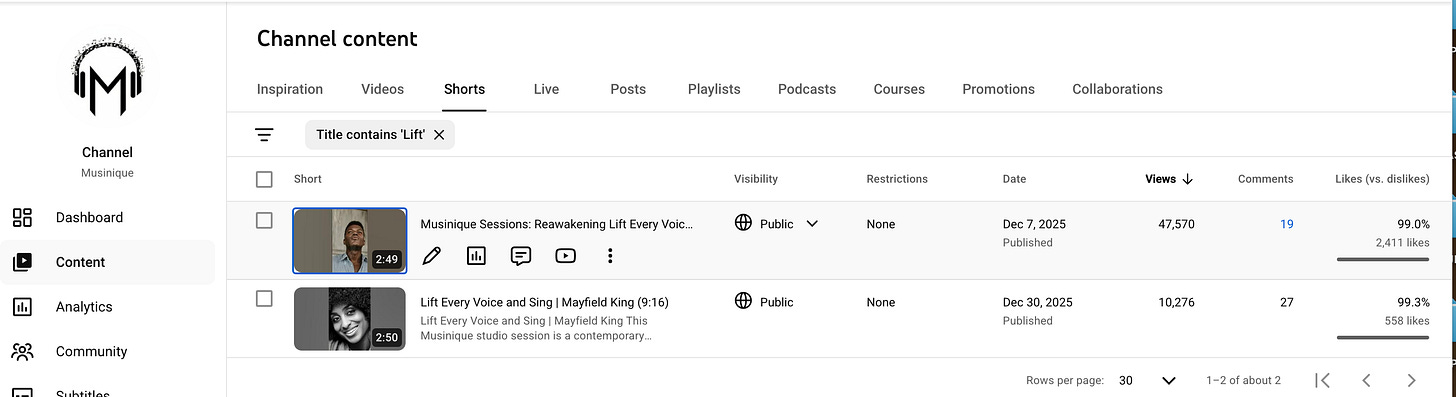 Kingdom Must Come Down, No Kings — remastered for “No Kings” week — has 1.28 million YouTube views and 49,499 likes at a 98.9% approval rate. The official music video added another 448,000. Musinique Sessions: Reawakening Lift Every Voice and Sing reached 47,568 views with 2,411 likes, 99% approval. The comment sections read like dispatches: “This song needs to be played on all radio stations.” “I can’t stop listening to it.” “This just became any oppressed country’s fight song.” The audience — spanning Bengali-speaking commenters and American anti-Trump protesters and Pakistani flag emojis and people asking if the military footage is real — found the music because the music was real enough to find.