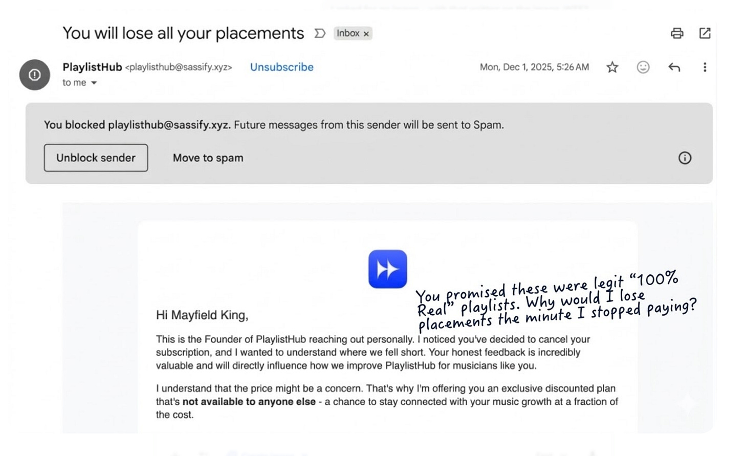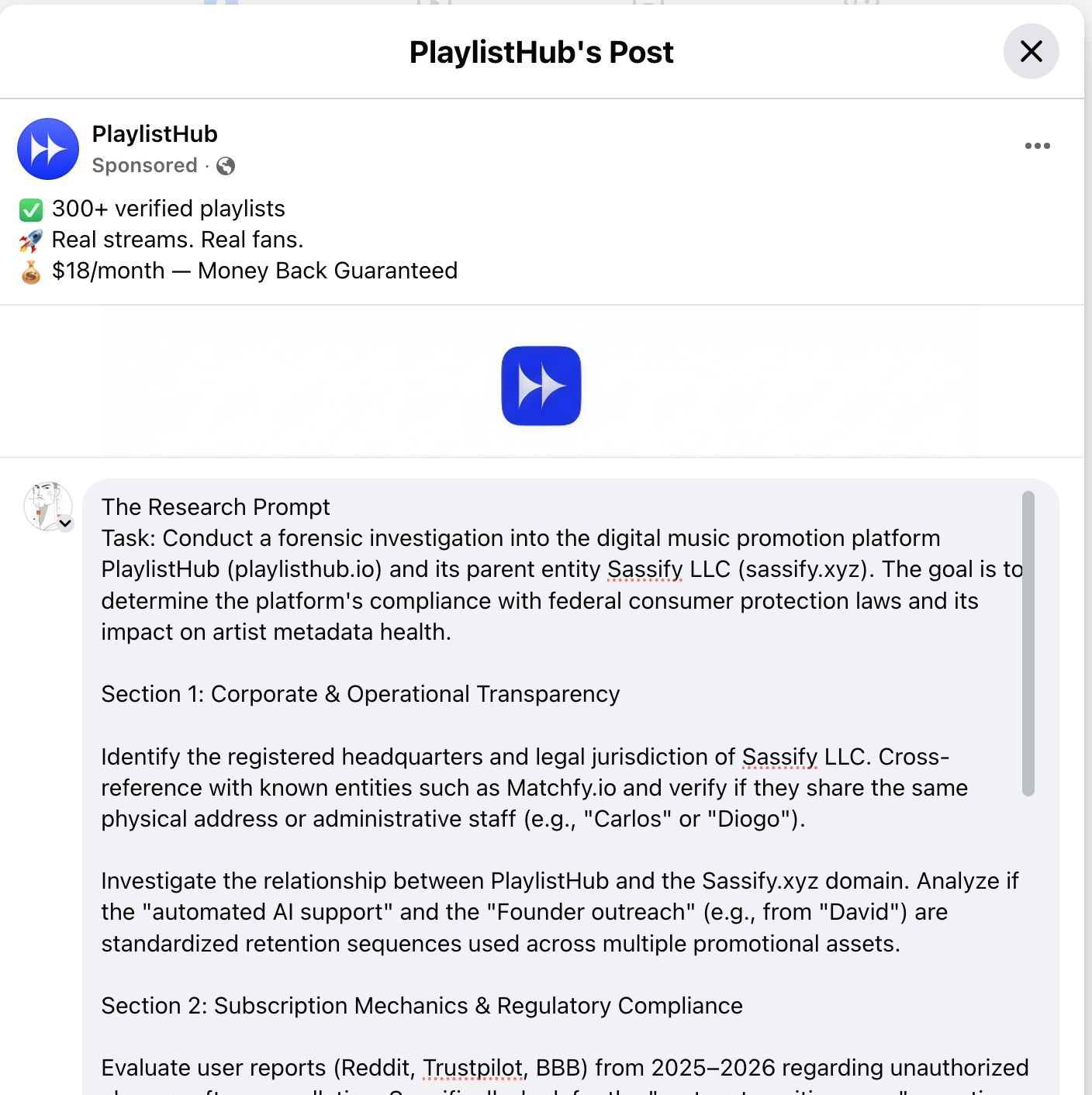 Tags: PlaylistHub Sassify LLC music promotion fraud, Spotify artist popularity score bot streams, ROSCA negative option subscription billing, Musinique Indie Playlist Intelligence Engine, metadata poisoning algorithmic damage independent artist