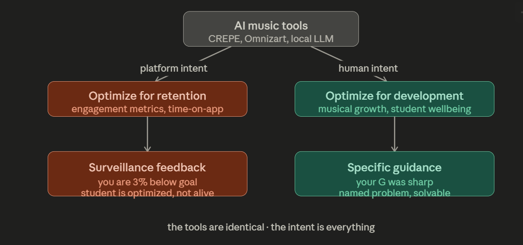 This distinction matters because the systems being described Trala, Violy, the Omnizart pipeline, the CREPE pitch tracker are neutral tools in the precise sense that Musinique has always meant: they will do whatever the person deploying them has decided they should do. An AI music tutor built by a company optimizing for retention metrics will make different choices than one built by an educator optimizing for musical development. The pitch correction feedback that feels like helpful guidance in one context feels like surveillance in another. The “objective assessment” that empowers one student to improve demoralizes another who needed to hear that her phrasing was beautiful before she heard that her intonation was off.