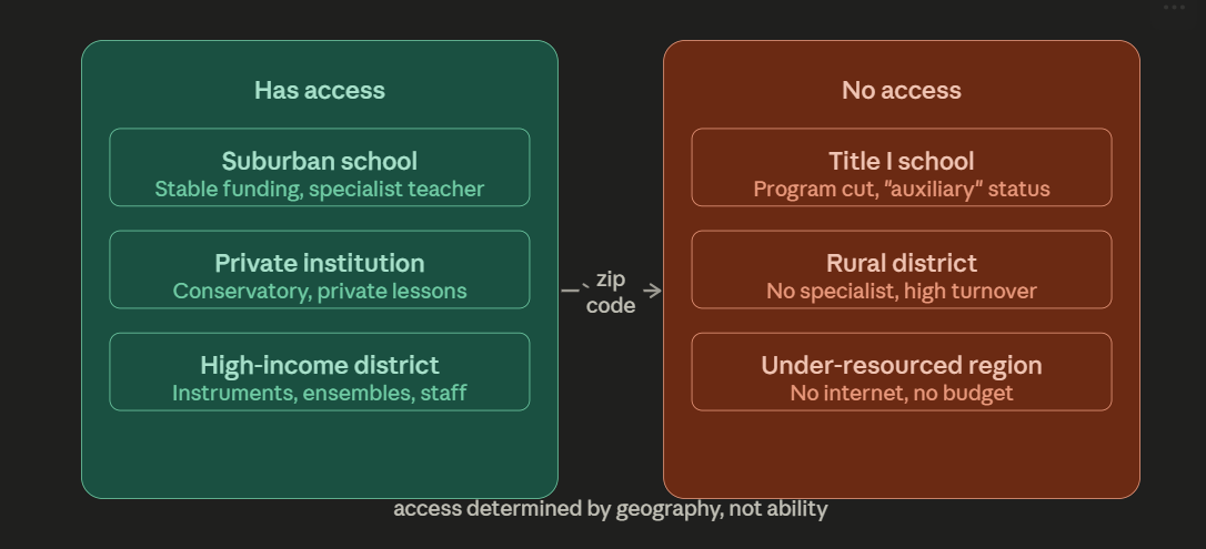 For most of human history, that feedback cost the presence of a human expert. The expert had to be trained, licensed, recruited to an underfunded district where the pay was low and the turnover was predictable. The “hierarchy of prestige” the paper describes where rural and Title I positions are entry points on the way to “bigger and better” suburban programs meant that even the students who briefly had a music teacher often lost her within a year or two. The expertise was rented, not owned. The program built around a single person’s institutional knowledge collapsed when that person left.