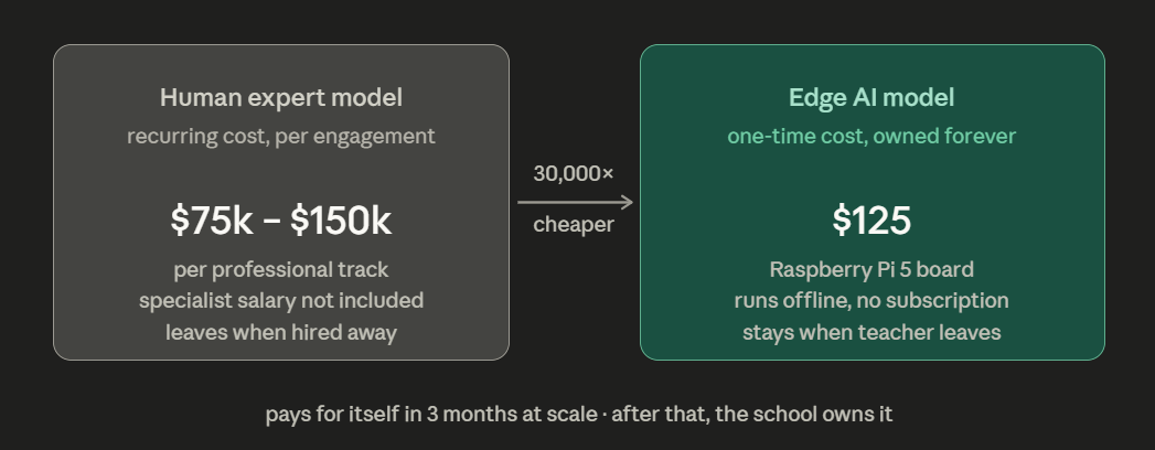What CREPE, Omnizart, and the Raspberry Pi ecosystem are collectively offering is something different: expertise that does not leave. A system that can identify pitch errors at 20-cent resolution finer than most human ears that runs offline, that does not require a subscription, that can be deployed in a school with no reliable internet connection and no technology budget beyond the one-time cost of a $125 board. The paper’s Total Cost of Ownership analysis is blunt: for 100,000 inference calls per day, the transition from cloud to local hardware pays for itself in three months. After that, the school owns the tool.