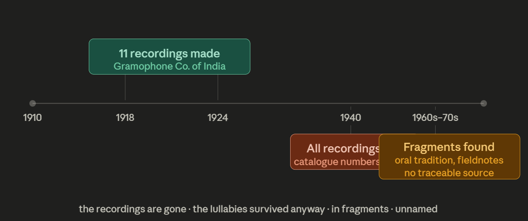 Champa Jaan was a tawaif a courtesan-musician of Lucknow’s kotha tradition, working in the early twentieth century. She was among the most formally trained musicians in India, a master of thumri and ghazal and Hindustani classical improvisation. She recorded eleven 78-rpm discs for Gramophone Company of India between 1918 and 1924. All are lost. Catalogue numbers survive. The music does not. Her lullabies persisted only because ethnomusicologists in the 1960s kept finding melodic fragments with Hindustani classical fingerprints that no one could trace to a source.